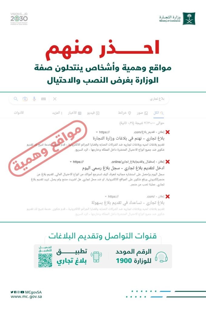 حذرت وزارة التجارة من مواقع وهمية وأشخاص ينتحلون صفة الوزارة، مستغلين محركات البحث ويدّعون من خلالها استقبال بلاغات المستهلكين.