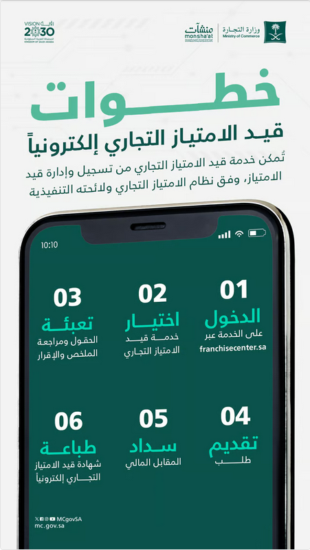 استعرضت وزارة التجارة الخطوات الستّ اللازمة لقيد الامتياز التجاري إلكترونيًّا.
