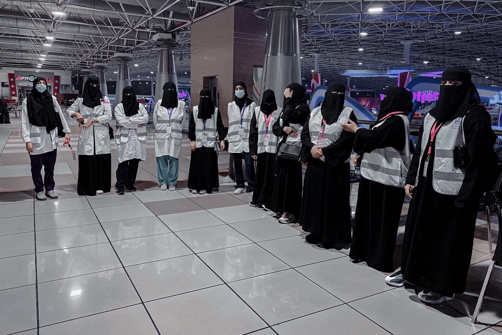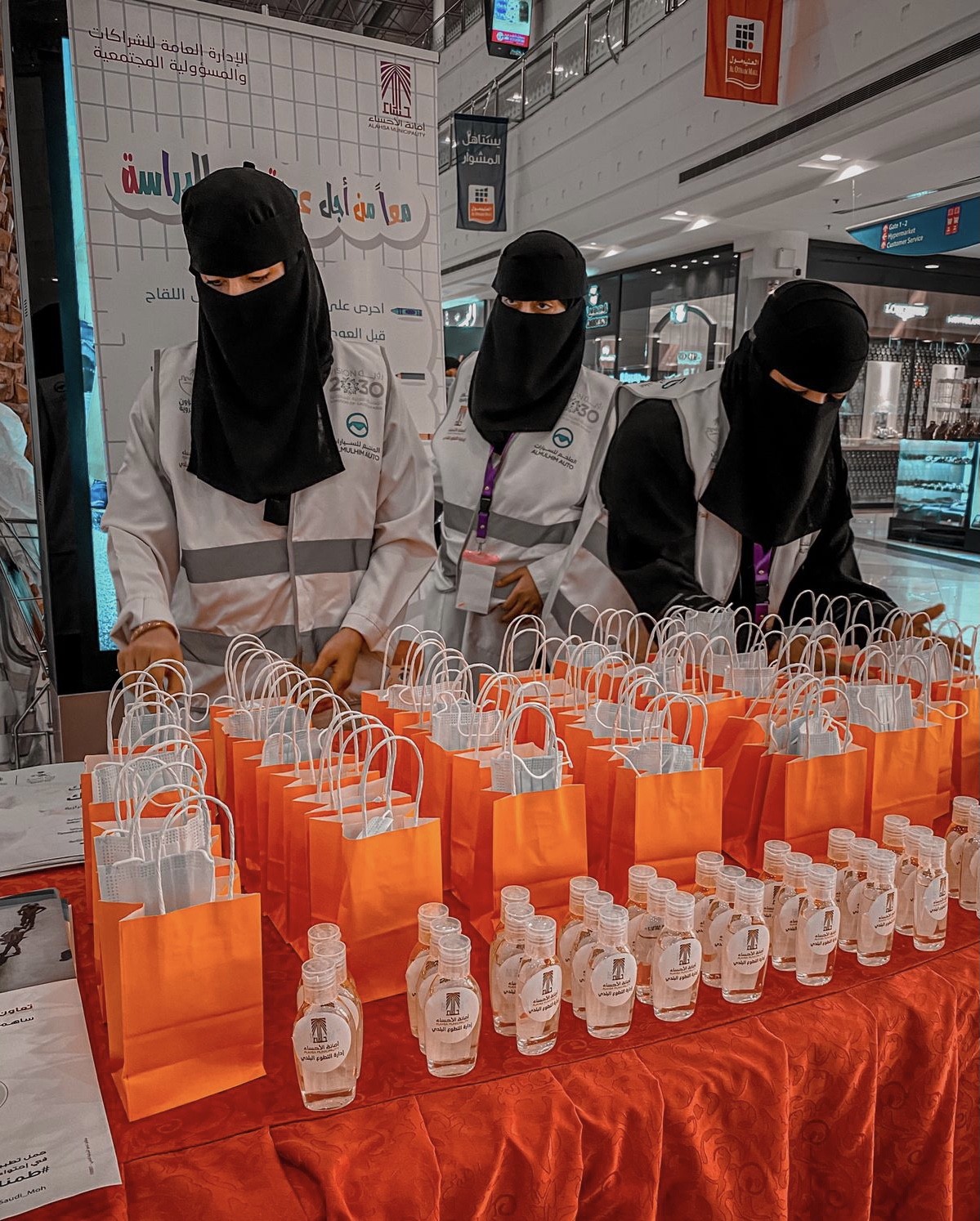 25 متطوعة تواجدن في كافة البوابات داخل المجمع، وساحة المطاعم والألعاب، ووزعن كمامات ومعقمات مجانا على الأطفال والأمهات، ووضعن المنشورات الصحية داخل المحلات التجارية وخارجها.
