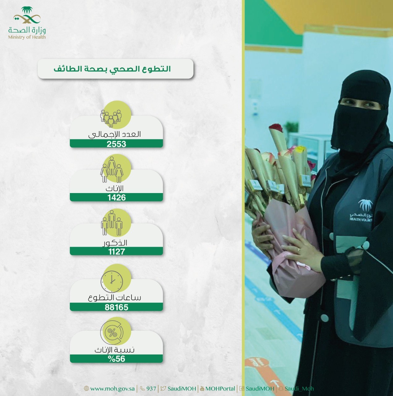 قدم المتطوعون والمتطوعات بصحة الطائف أروع نموذج في دعم ومساندة مراكز لقاح "كورونا" منذ انطلاقتها ,حيث بذلوا أكثر من 88 ألف ساعة عمل في سبيل خدمة الآخرين , وتفوقت فئة النساء على الرجال في العدد بنسبة وصلت إلى 56%.