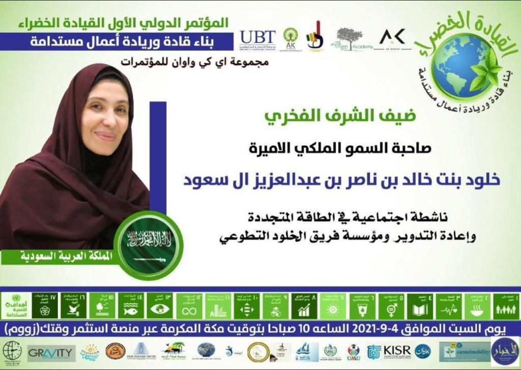 نظمت رئيس مجموعه شركة كى وان للمؤتمرات المستشارة خلود الشمرى المؤتمر الأول للقيادة الخضراء تحت شعار بناء وريادة على منصة zoom وعبرت المستشارة خلود الشمري عن فخرها بالجهود الدبلوماسية لنجاح هذا المؤتمر ٠