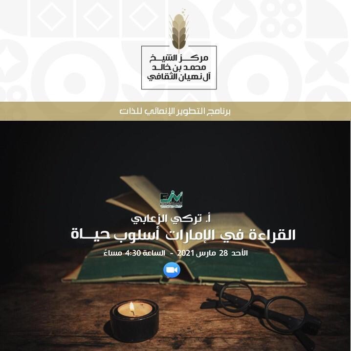 محاضرة بعنوان (القراءة في الإمارات أسلوب حياة ) يقدمها المدرب تركي الزعابي اليوم الأحد 28 مارس 2021 م