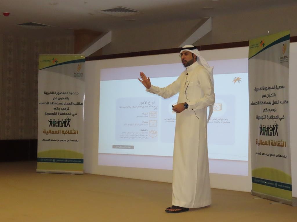 نظمت جمعية المنصورة الخيرية للخدمات الاجتماعية والتنموية، بالتعاون مع مكتب العمل بمحافظة الأحساء، مساء أمس الأربعاء، محاضرة توعوية بعنوان "الثقافة العمالية"، في مقر الجمعية، قدمها المهندس "ماجد المسبح"، بحضور مدير مكتب العمل "علي العطية" ونائب رئيس الجمعية "شاكر الوباري"، وعدد من المقبلين والمقبلات على سوق العمل والمهتمين.