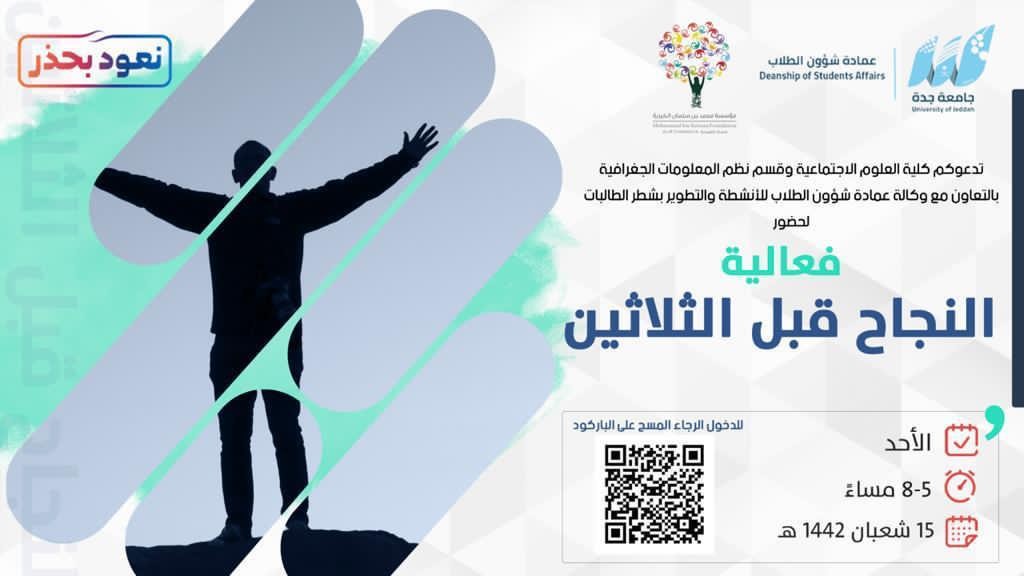 ‎انطلاقاً من رؤية جامعة جدة لإعداد قادة المستقبل، وبرعاية وكالة عمادة شؤون الطلاب للأنشطة و التطوير ، أقامت كلية العلوم الاجتماعية بالتعاون مع قسم نظم المعلومات الجغرافية فعالية النجاح قبل الثلاثين و ذلك يوم الأحد الموافق 15/8/1442هـ.  وتمثلت أهداف الفعالية في تحفيز  الجيل المرتقب للنجاح والتغلب على التحديات والصعوبات بالشغف والطموح ، وتم تقديم تجارب ملهمة متمثلة في لقاء مع سعادة أ.د. آمال بنت يحيى الشيخ (عضو مجلس الشورى) كشخصية قيادية ناجحة ومؤثرة.