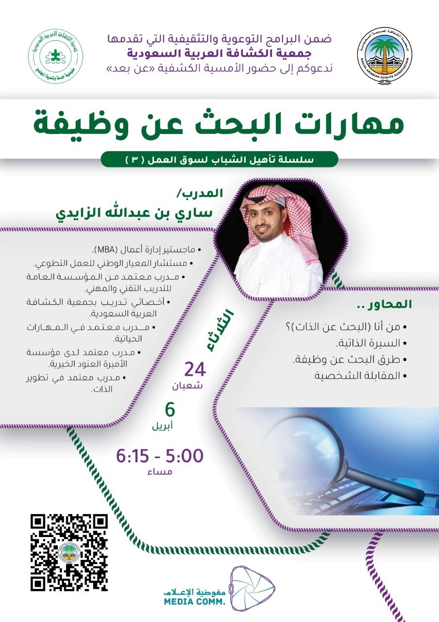 تُنظم أمانة جمعية الكشافة العربية السعودية ، يوم غدٍ الثلاثاء أمسية كشفية افتراضية تحت عنوان " مهارات البحث عن وظيفة " ، يُقدمها المدرب ساري بن عبدالله الزايدي ، ضمن سلسة تأهيل الشباب لسوق العمل التي تقوم بها مفوضية خدمة وتنمية المجتمع بأمانة الجمعية .