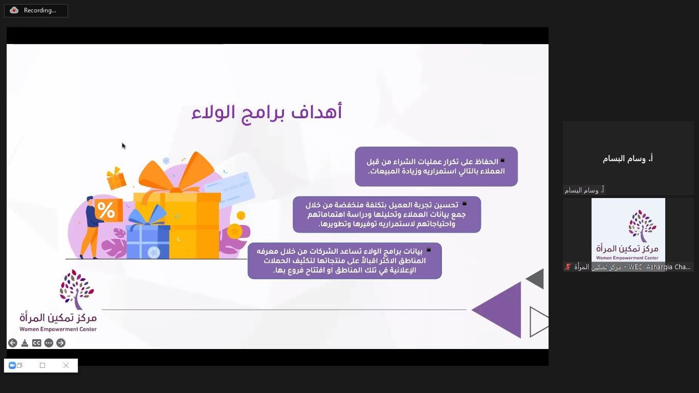 وقالت البسام خلال المحاضرة التي عقدت مساء الاثنين 27 ديسمبر 2021 بأن برامج الولاء هي احدى الانشطة التسويقية التي تحفز العملاء على تكرار تجربة شراء منتجات او الاشتراك في الخدمات بهدف ضمان توطيد علاقة بين العملاء والعلامة التجارية بالتالي ضمان تحقيق ربح مستمر للمشروع وكسب عملاء دائمين.
