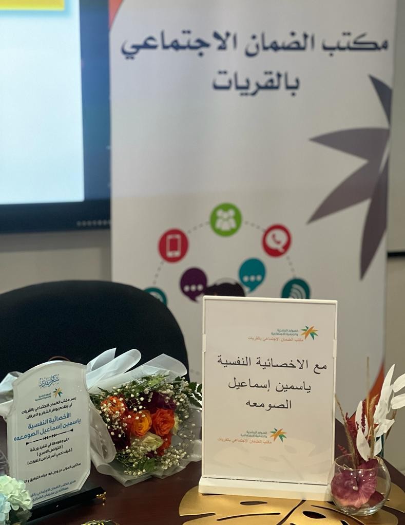 وفي نهايه الروشه تم تكريم الاخصائية النفسيه/ ياسمين اسماعيل الصومعه وكذلك مديره المتوسطه الرابعه / سميحه مفلح العازمي من قبل مكتب الضمان الاجتماعي بالقريات