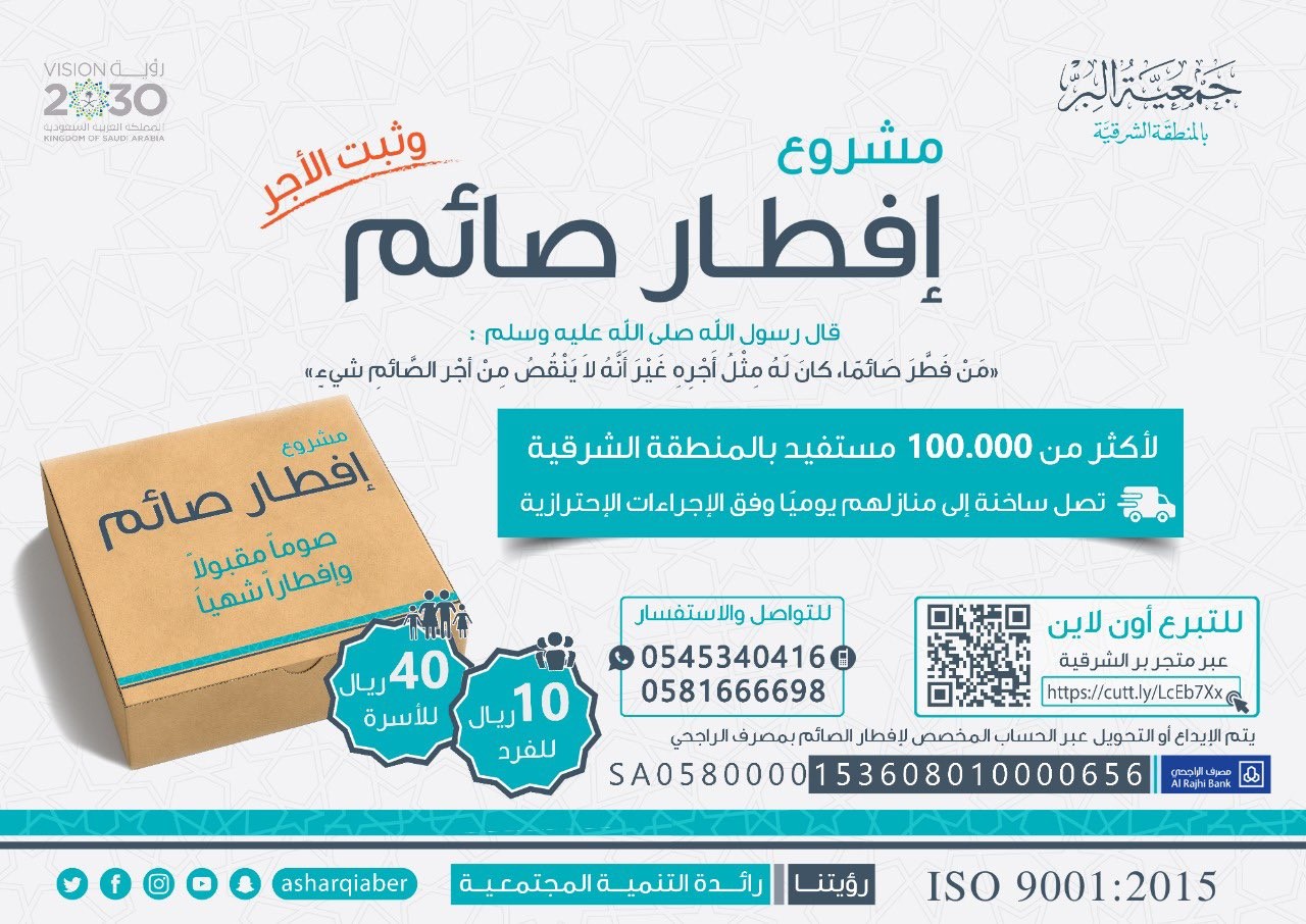 كشف الأمين العام لجمعية البر بالمنطقة الشرقية سمير العفيصان أن هناك 115 ألف مستفيد يستفيدون من برنامج إفطار صائم الذي تنفذه الجمعية في رمضان في فروعها في الدمام والخبر وبقيق والنعيرية وأم الساهك ورأس تنورة، حيث تصلهم الوجبات يوميا من المطاعم المتعاونة مع الجمعية في كل مدينة.