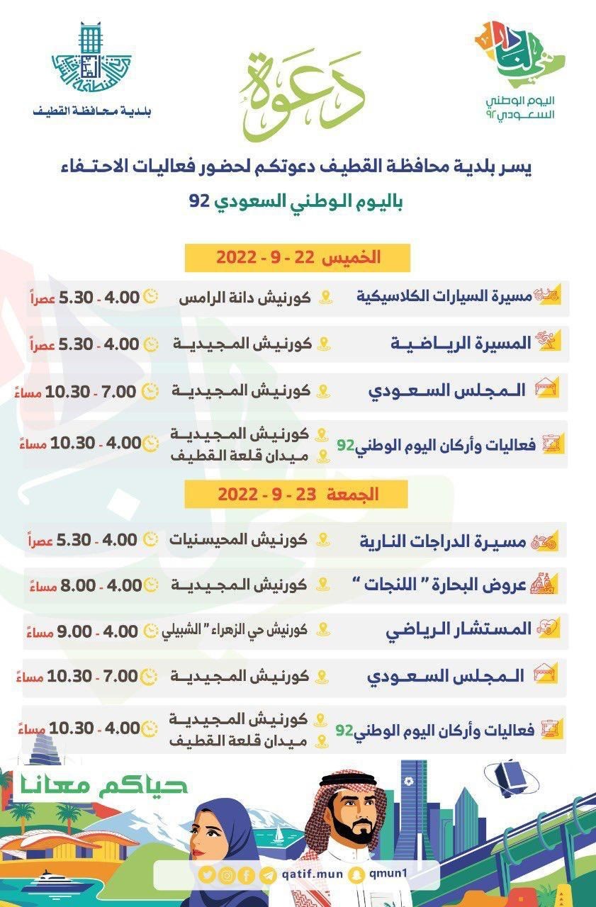 ووجهت البلدية الدعوة للمواطنين والمقيمين للمشاركة في الفعاليات التي أعدتها بتلك المناسبة حيث كتبت على حسابها بتويتر: بمناسبة الاحتفاء باليوم الوطني؛ بلدية محافظة القطيف تدعوكم لحضور فعاليات اليوم الوطني السعودي 92 ، وذلك يومي الخميس والجمعة الموافق ٩/٢٢ و ٢٠٢٢/٩/٢٣م، والذي يتضمن العديد من البرامج و الأنشطة الترفيهية…. حياكم معانا وكل عام ومملكتنا بعز وأمان.
