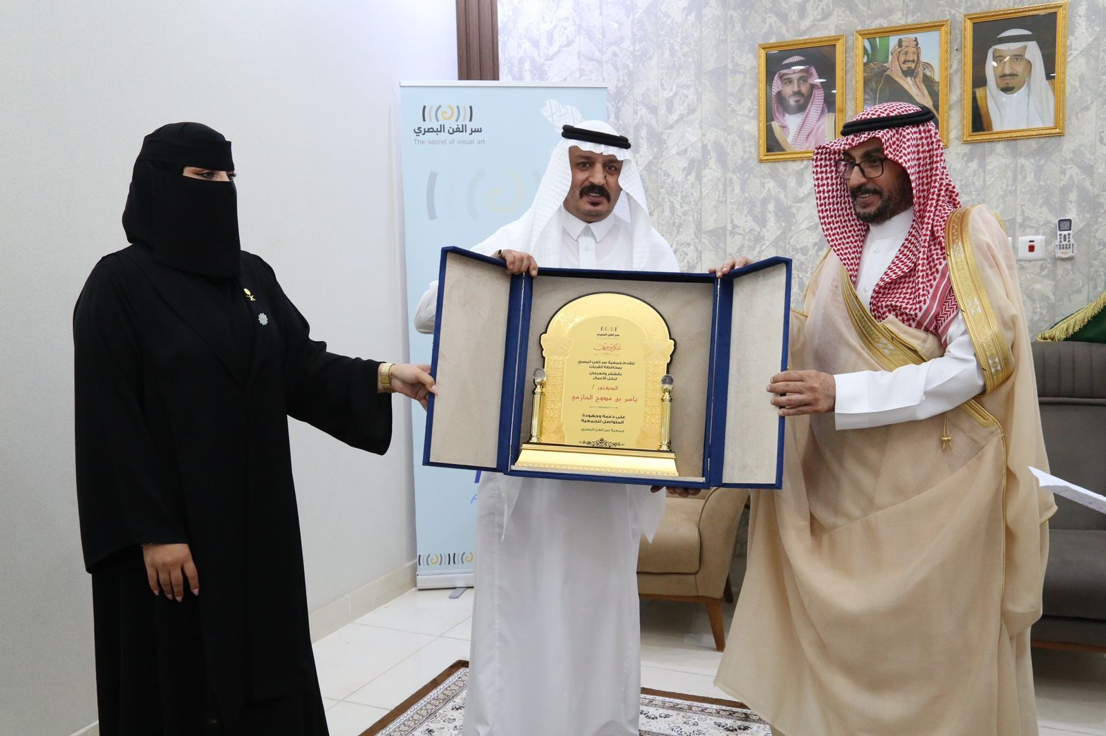 وكان باستقبال سعادته لدى وصوله  أ. هيا الموسى رئيس جمعية  سر الفن البصري بالقريات  واعضاء الجمعية  د. ياسر المدوح  وأ. محمد الحلوان .