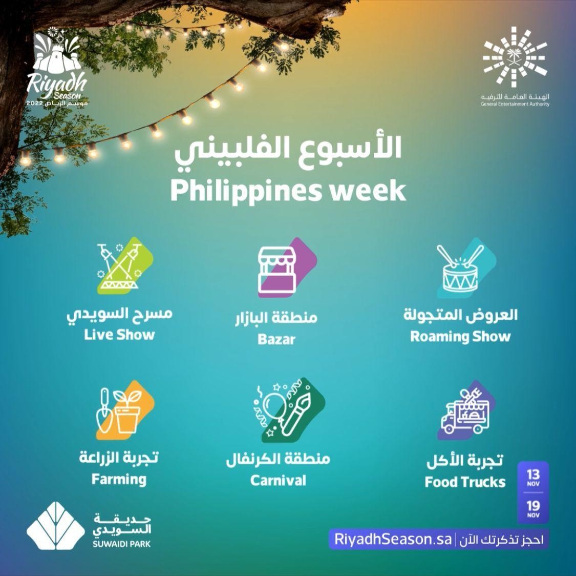ويشتمل الأسبوع الفلبيني الذي يقام ضمن فعاليات الموسم على فعاليات ترفيهية عديدة تتنوع بين العروض المسرحية على مسرح حديقة السويدي، والعروض المتجولة، إضافةً إلى الاستمتاع بالتسوق والتجول في منطقتي البازار والكرنفال.