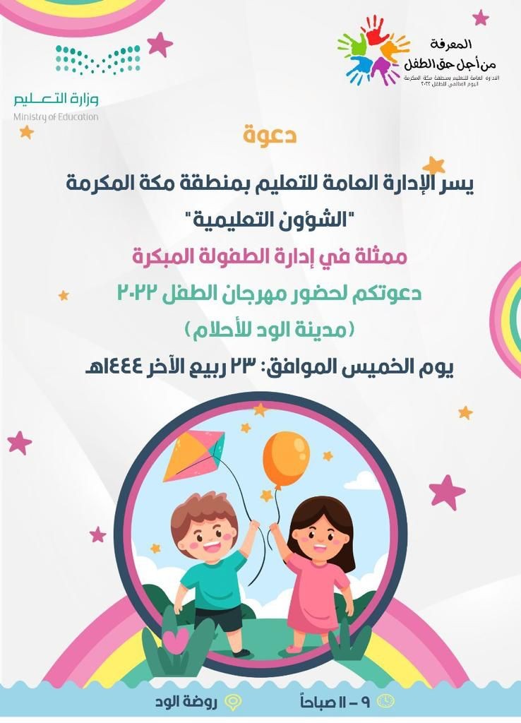انطلقت بالإدارة العامة للتعليم بمنطقة مكة المكرمة ممثلةً بإدارة الطفولة المبكرة ولمدة أسبوع حتى يوم الخميس 17 نوفمبر 2022 ، فعاليات اليوم العالمي للطفل تحت شعار ( المعرفة من أجل حق الطفل) بإشراف مديرة الإدارة زكية الصبحي.