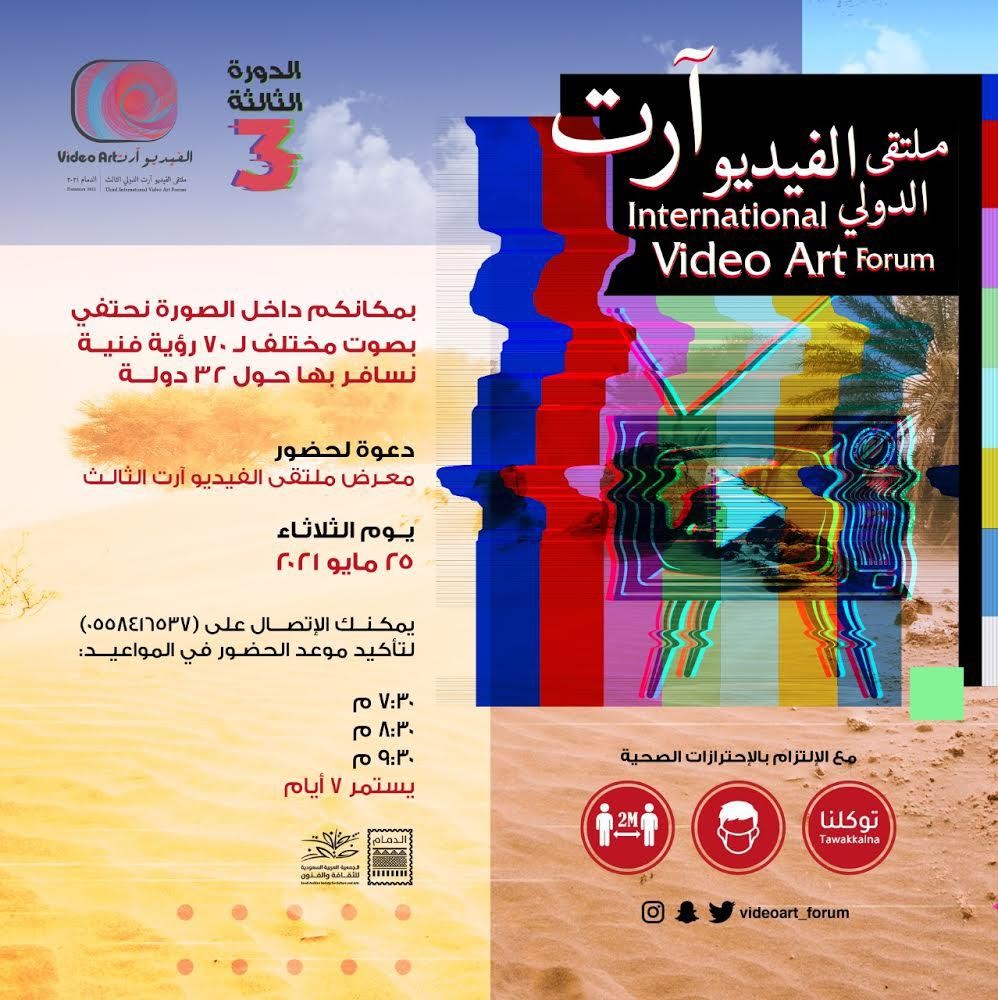 يفتتح مساء الثلاثاء ٢٥ مايو الدورة الثالثة من الملتقى الدولي للفيديو آرت بالدمام، حيث سيكون الجمهور على موعد مع ٧٠ عملا فنياً من ٣٢ دولة من مختلف دول العالم، ستحمل رسائل فنية وجمالية متنوعة تستمر خلالها العروض لمدة أسبوع تتوازى معها البرامج والورش ويتخللها لقاءات وتواصل ثري بين الباحثين والمختصين والفنانين.