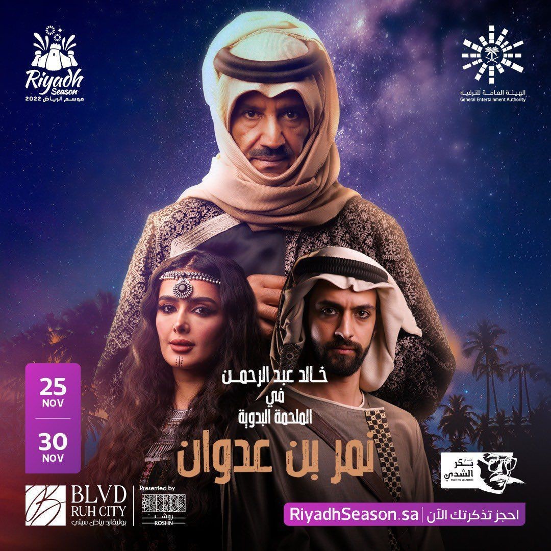 في لحظةٍ انتظرها وترقبها بشغف جمهور عريض من محبّي الفن السعودي في فعاليات موسم الرياض 2022، تنطلق غدًا الجمعة عروض المسرحية الغنائية الاستعراضية "نمر بن عدوان" من بطولة الفنان القدير خالد عبد الرحمن؛ في تجربة مثيرة لفنّانٍ تعوّد الجميع أن يراه مغنيًا، لا ممثلًا على خشبة المسرح.