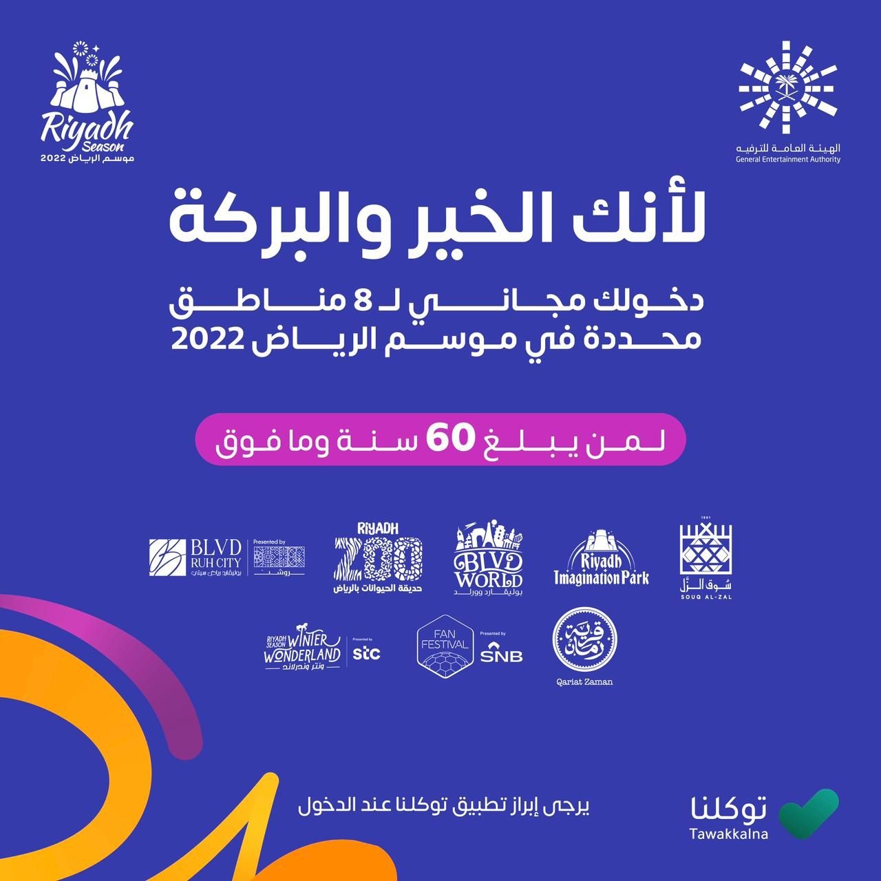 منح موسم الرياض 2022 فرصة الدخول مجانًا لكبار السن (60 عامًا فأكثر)، لثماني مناطق ترفيهية من خلال تطبيق توكلنا، حيث تحتوي المناطق على العديد من الفعاليات المتنوعة التي تناسب جميع الفئات العمرية من مختلف شرائح المجتمع.
