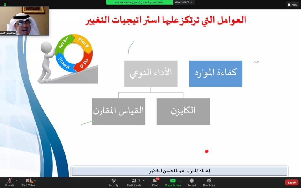 وأوضح الخضر في مستهل ورشته أهمية عملية التغيير في المنشآت حيث أنها ضرورة وليست ترف كي تلبي حاجات المستفيد وتحقق مستوى متقدم في التنمية البشرية بشكل مستدام؛ فنحن اليوم أمام تحدي حقيقي في الميدان نحو إدارة التغيير؛ ثم افتتح الورشة بتدريب للحضور للمناقشة ووضع التوقعات والحلول.
