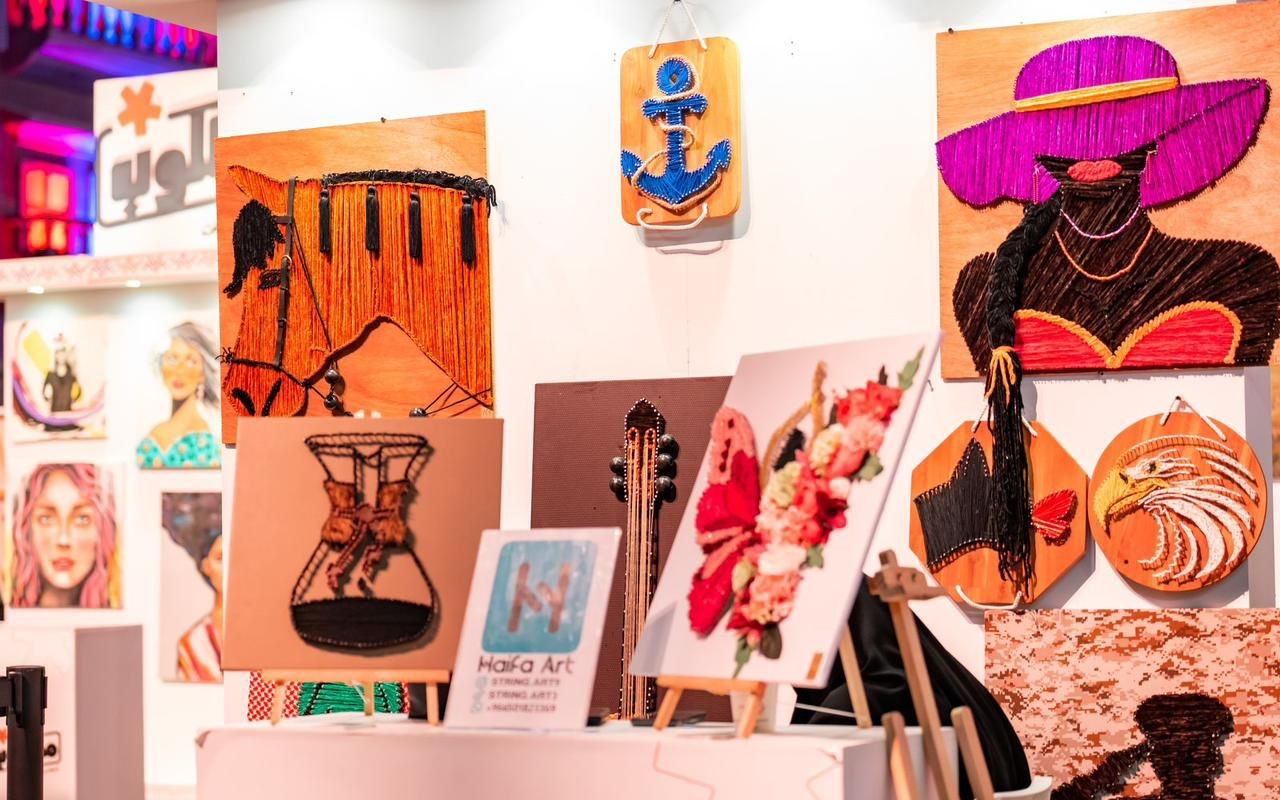 ويحتوي المعرض الذي يفتح أبوابه للزوار كل يوم من الساعة 5 إلى الساعة 11 مساء حتى الثاني من فبراير المقبل، على أنواع مختلفة من الرسومات الفنية كالميداليات التي تبدو بأشكال وألوان متنوعة، ورسومات مزج فيها المبدعون الخيوط بألوانها، باستخدام مسامير مثبتة على ألواح خشبية، إضافة إلى الرسم على السجاد باستخدام الألوان المختلفة مع أدوات الخياطة والخيال الواسع لاستلهام الأنماط والأشكال، لصناعة لوحات فنية ذات دقة إبداعية مميزة، مما يدل على التنوع في ابتكار الأفكار، واختلاق الرؤى الإبداعية المغايرة.