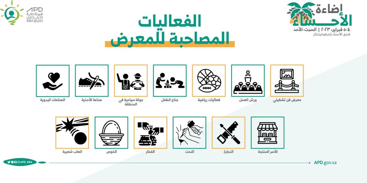 تحتضن واحة الأحساء المعرض الفني المتنقل للأشخاص ذوي الإعاقة ملتقى (إضاءة الأحساء )في الفترة من ٤ - ٥ من شهر فبراير والذي تنظمه هيئة رعاية ذوي الإعاقة في فندق الانتركونتيننتال ويشتمل الملتقى على ورش عمل تستهدف ذوي الإعاقة لرفع كفائتهم وتاهيلهم ودمجهم في المجتنع من خلال المعرض المصاحب للملتقى الذي يحوي العديد من الاركان: