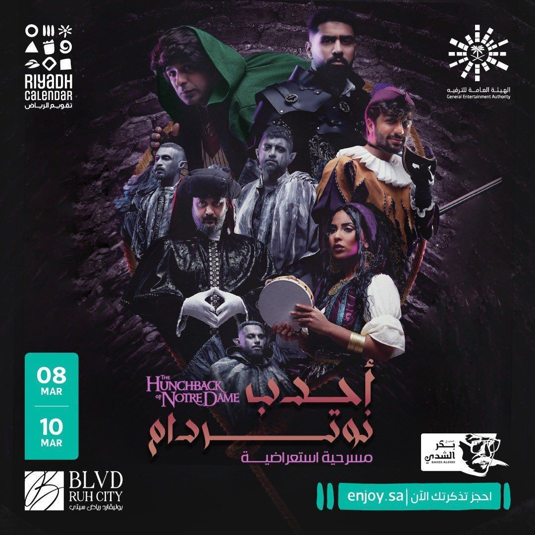 المملكة العربية السعودية، 4 مارس 2023: ضمن فعاليات تقويم الرياض تنطلق في 8 مارس الجاري عروض مسرحيتي "أحدب نوتردام" على مسرح بكر الشدي، ومسرحية "بعد ما شاب" بمسرح محمد العلي في منطقة بوليفارد رياض سيتي، وتستمر عروض المسرحيتين لمدة ثلاثة أيام متتالية بعدد من المشاهد والسيناريوهات المستوحاة من خفايا وأسرار باريس في القرون الوسطى.