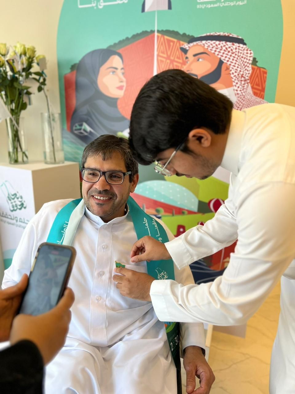 و توشّح الحضور بالأوشحة الخضراء وتزينت مداخل المقر الرئيسي بشعار”نحلم ونحقق”، الذي يعكس اقتراب تحقيق احلام وطموحات المملكة في كافة المجالات والتطورات التي حدثت من مشاريع ضخمة راهنت عليها المملكة في رؤيتها 2030.