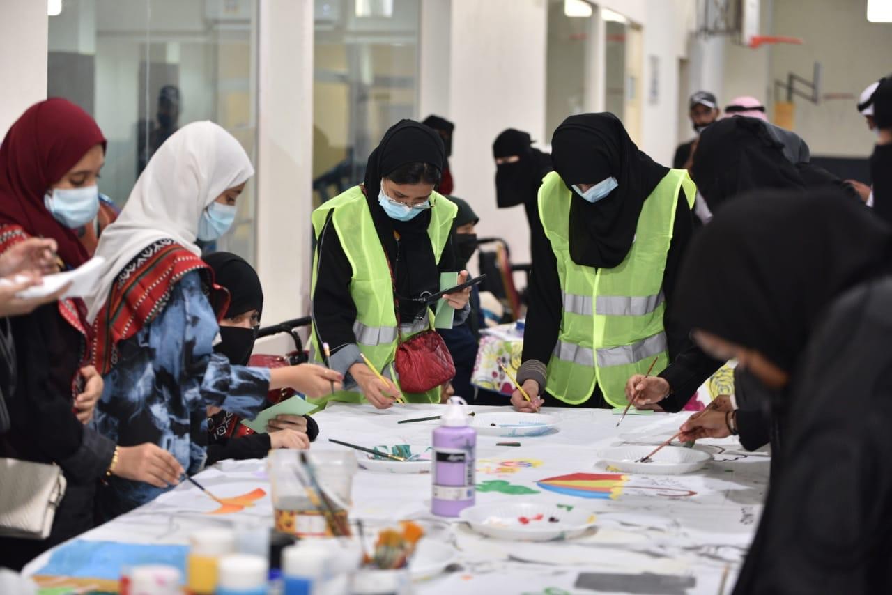وقد شارك في المبادرة اكثر من مائة متطوع ومتطوعة تنوعت مشاركاتهم بين رسم جدارية السعادة ، ولوحة المحبة والسلام العالمية ، واركان الحرف الشعبية ، وكانت أركان ذوي الاحتياجات الخاصة المبدعين الأكثر وهجاً ، حيث تنوعت بين الرسم والتأليف ، ركن خاص للمبدعة خديجة السكيني ومؤلفاتها الأدبية ، وركن لمسابقات الترفيهية مع مها العميري ، والفنان الجميل المبدع علي الجبارة ،