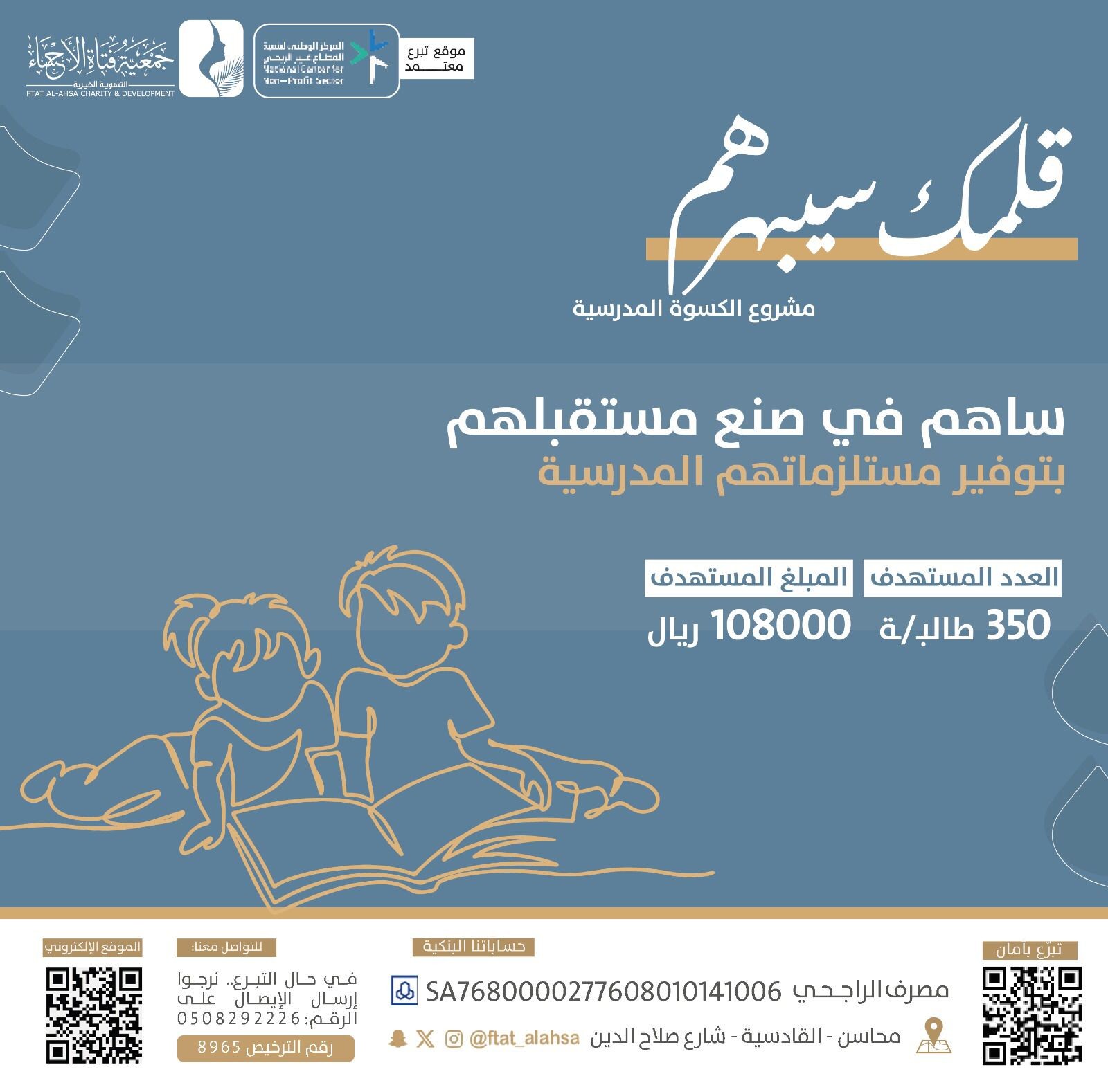 أطلقت جمعية فتاة الأحساء هذا الأسبوع مشروع "قلمك سيبهرهم" لتأمين الحقيبة المدرسية لأبناء الأسر التي ترعاها، حيث تستهدف الجمعية مبلغًا إجماليًا قدره (108,000) ريال لتوفير الحقيبة المدرسية لعدد (350) طالبًا وطالبة. أوضحت ذلك عضو مجلس الإدارة نوره العثمان، حيث سيتم بإذن الله إيداع المبلغ المخصص للحقيبة المدرسية في بطاقات منافذ للأسر لاختيار ما يناسبهم من المستلزمات المدرسية.