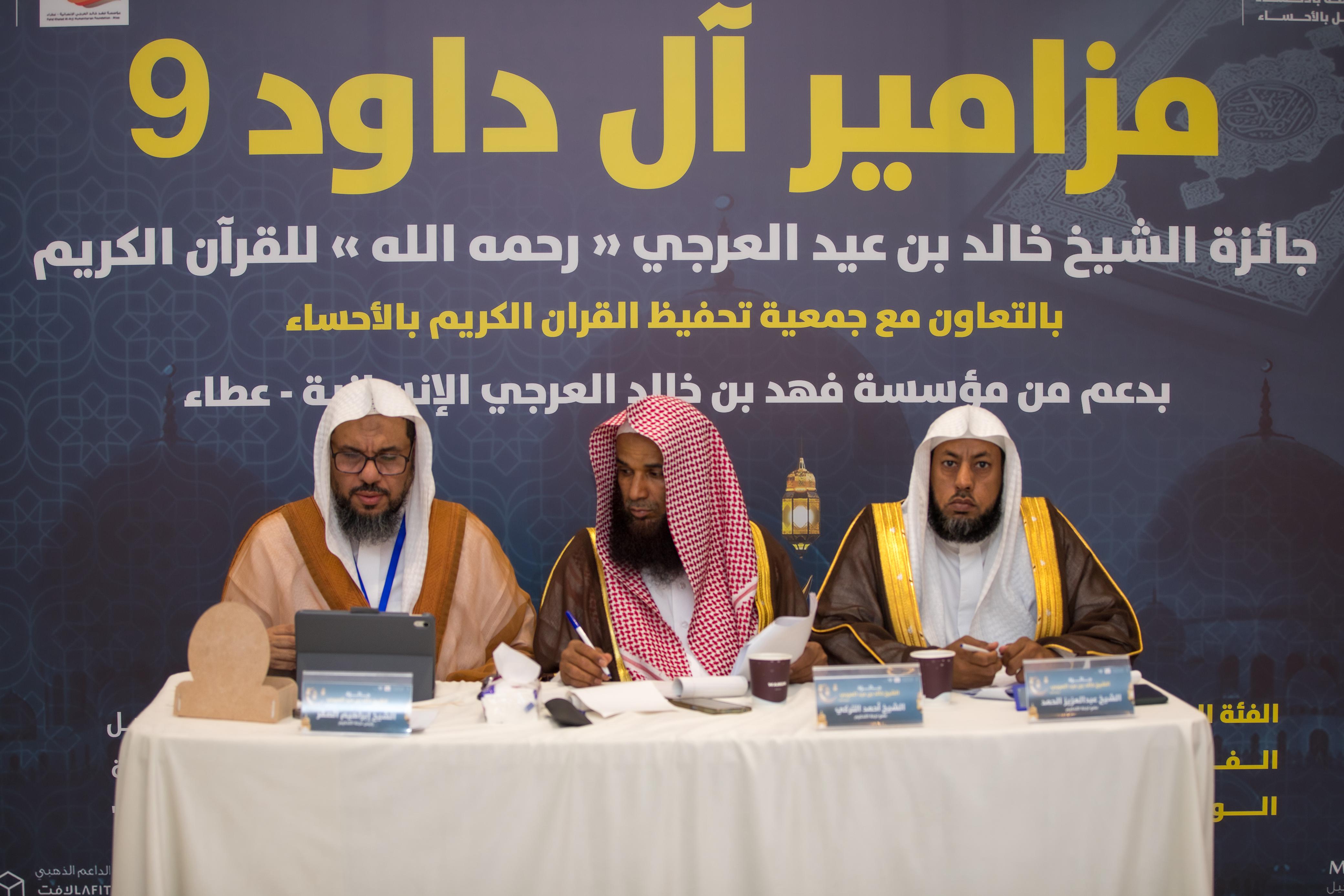 اختتمت مساء يوم  السبت مسابقة نادي الجيل بالأحساء على جائزة الشيخ خالد العرجي "رحمه الله" للقرآن الكريم "مزامير آل داود" في نسختها التاسعة بالتعاون مع جمعية تحفيظ القرآن "خير" وبدعم مؤسسة فهد بن خالد العرجي الإنسانية "عطاء"  بمشاركة نحو 300 متسابق من محافظة الأحساء وكذلك عدد من محافظات المنطقة الشرقية وعدد من ثمان من الجنسيات المختلفة، منهم 40 من فئة الصم بالتعاون مع جمعية الأشخاص ذوي الإعاقة بالأحساء، و10 من فئة ملازمة داون، وحضر الحفل رئيس مجلس جمعية تحفيظ القرآن الكريم بالأحساء الشيخ ناصر النعيم، ورئيس مجلس أمناء الجائزة فهد العرجي، ومدير الهيئة العامة للأوقاف بالمنطقة الشرقية الدكتور أحمد بوعلي، ومدير إدارة المساجد والدعوة والإرشاد بالأحساء  صالح الدقيل ، والمدير التنفيذي لجمعية الأشخاص ذوي الإعاقة بالأحساء  عبداللطيف الجعفري، وأبناء الشيخ خالد العرجي رحمه الله وعدد من الضيوف من أصحاب الفضيلة والسعادة ورجال الأعمال وعدد من الإعلاميين.