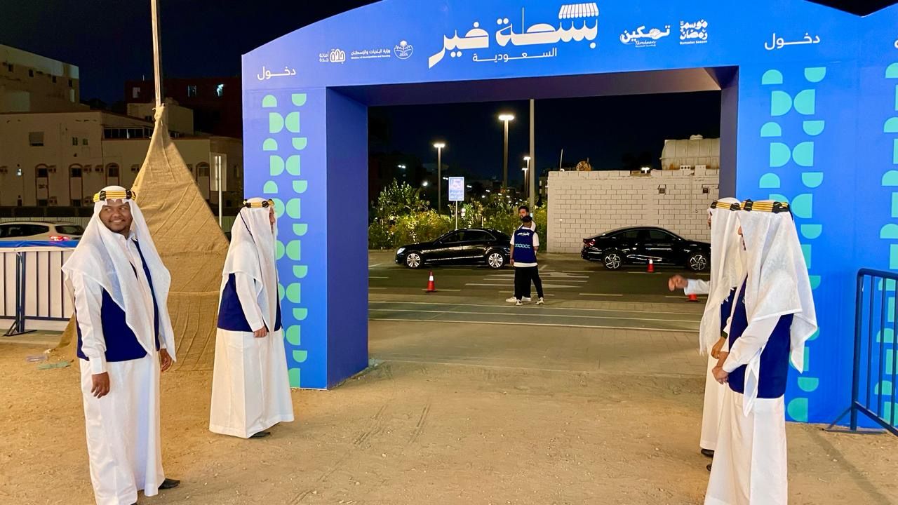 في فعالية "بسطة خير السعودية" ليست فقط الأجنحة المشاركة التي ستصادفك عند الدخول، وإنما مجموعة من الشباب يتراصون على جانبي بوابة الدخول، يرحبون بك بأهازيج تكسر حاجز الصمت، لتبدأ جولتك بحماس.