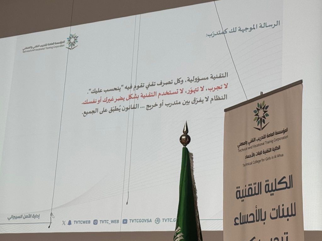 من جانبها، أوضحت عميدة الكلية سارة الصرعاوي أن المؤسسة العامة للتدريب التقني والمهني تولي اهتمامًا بالغًا بالتوعية المستمرة بالأمن السيبراني، وتحرص على تنفيذ سياساته داخل الوحدات التدريبية.