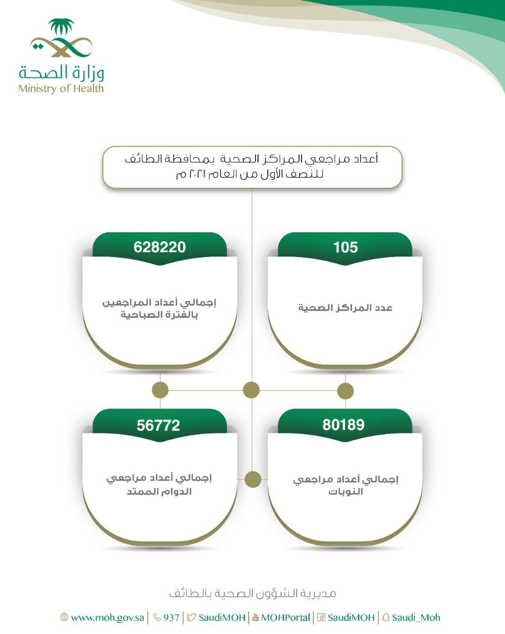 كشفت صحة الطائف، إن عدد المراجعين للمراكز الصحية التابعة لها بلغ 765181 مراجع، خلال النصف الأول للعام الجاري 2021 وذلك من خلال 105مركز رعاية أولية، موزعة حسب الحدود الجغرافية لمحافظة الطائف.