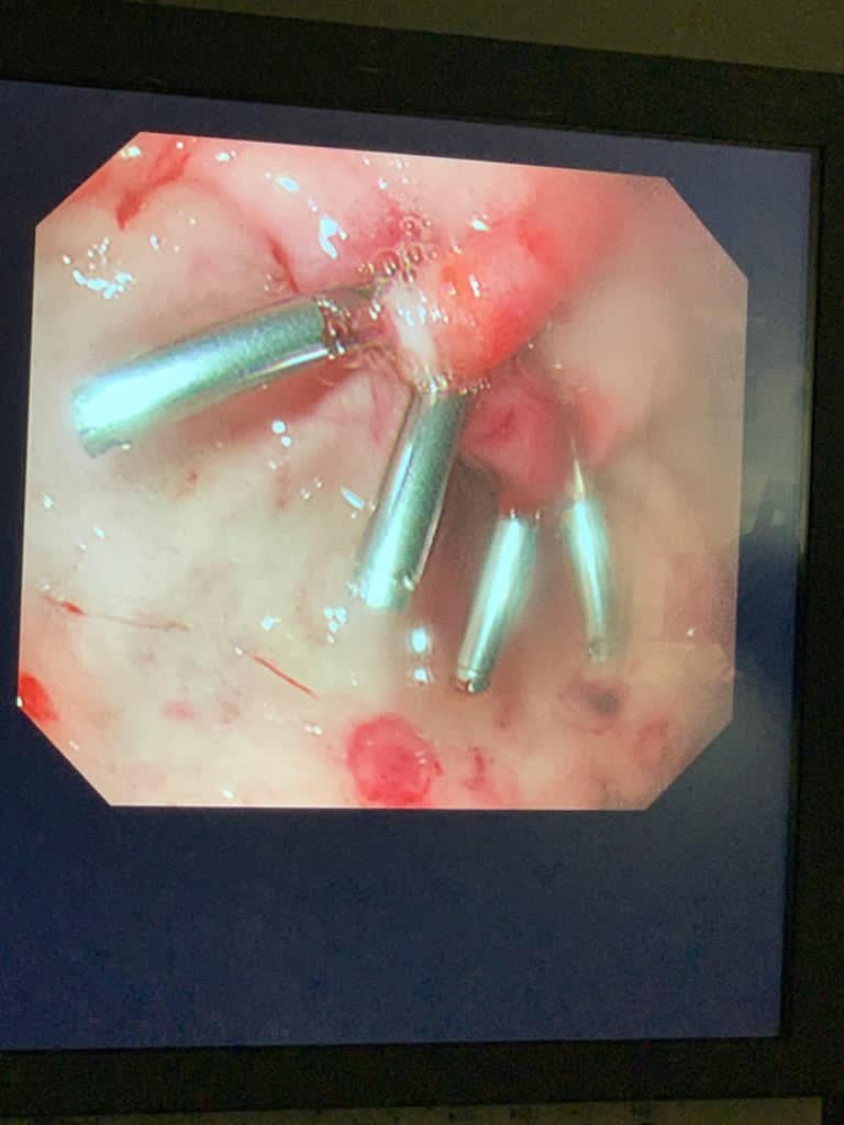 تبين وجود قرحة معدية نازفة تمت السيطرة عليها بالربط بالهيموكليب والتي عادة ماتسقط بعد الشفاء .