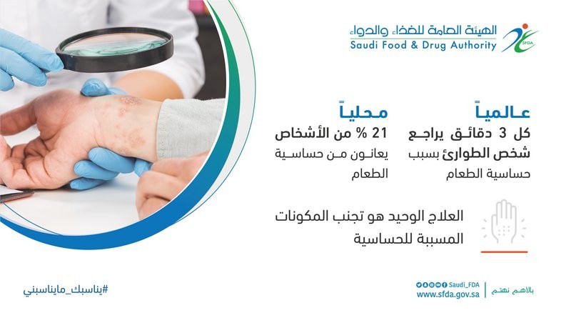 أكدت هيئة الغذاء والدواء، أن حساسية الطعام من الأمور الشائعة في العالم، ويُقَدَّر انتشاره في المملكة بـ21% للأشخاص البالغين.