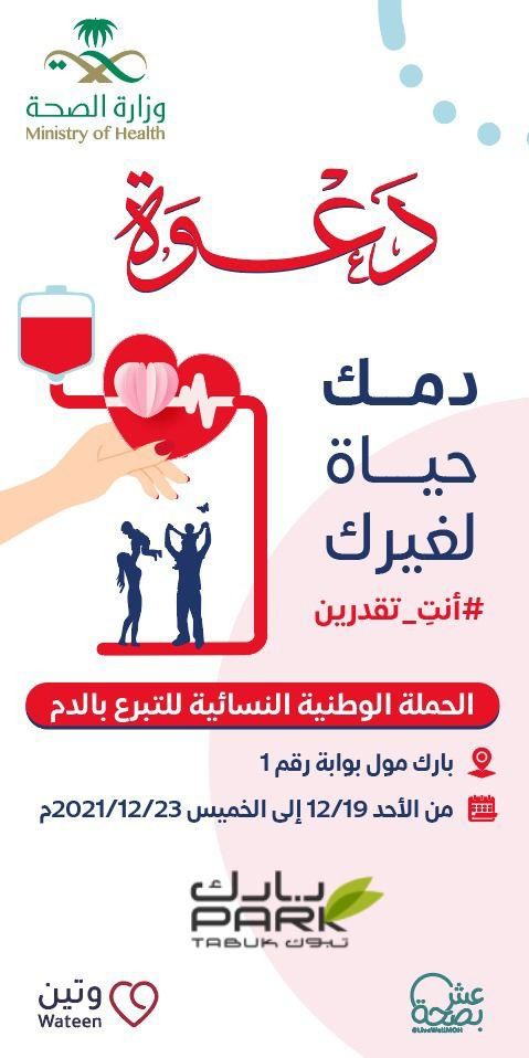 أطلقت المديرية العامة للشؤون الصحية بمنطقة تبوك اليوم الاحد الحملة الوطنية النسائية للتبرع بالدم بمجمع بارك مول تبوك تحت شعار (أنت تقدرين )وذلك بمشاركة ادارة المختبرات وبنوك الدم ومستشفى الملك فهد التخصصي ومستشفى الملك خالد ومستشفى الولادة والاطفال وتستمر لمدة خمسة ايام من 19-23 ديسمبر 2021م .