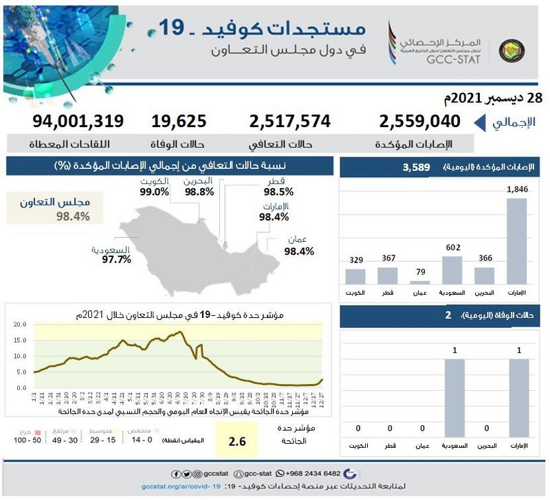 تجاوز عدد لقاحات كورونا المعطاة بدول مجلس التعاون الـ 94 مليون جرعة، فيما بلغت نسبة التعافي من الفيروس بالسعودية 97.7%.
