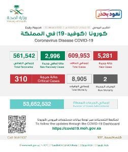 وقالت الوزارة إنه تم تسجيل 2996 حالة تعافٍ جديدة ليصبح الإجمالي 561542 حالة ولله الحمد.