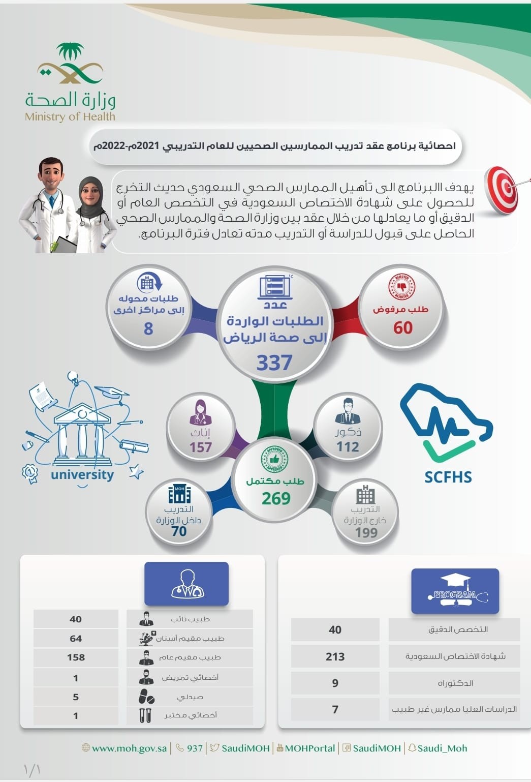 أعلنت المديرية العامة للشؤون الصحية بمنطقة الرياض عن استقبال (337) طلباً للقبول بالمراكز التدريبية بمنشآتها أو خارجها للبرامج المنفذة تحت مظلة الهيئة السعودية للتخصصات الصحية والجامعات في المملكة، وذلك عبر برنامج عقد تدريب الممارسين الصحيين للعام التدريبي 2021/2022م .