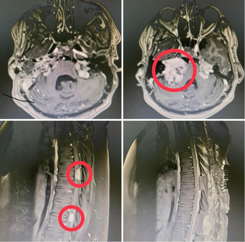 حيث تم تحضير المريض لاحقا لعمل التدخل الجراحي الثاني  للورمين الضاغطين على الحبل الشوكي في تدخل  جراحي واحد وتحت المراقبة العصبية واستخدام الميكروسكوب الجراحي حيث استغرق التدخل الجراحي ست ساعات والتي أوضحت نتائجها وجود ورمين من نوعين مختلفين أحدهما سحائي والآخر ليفي