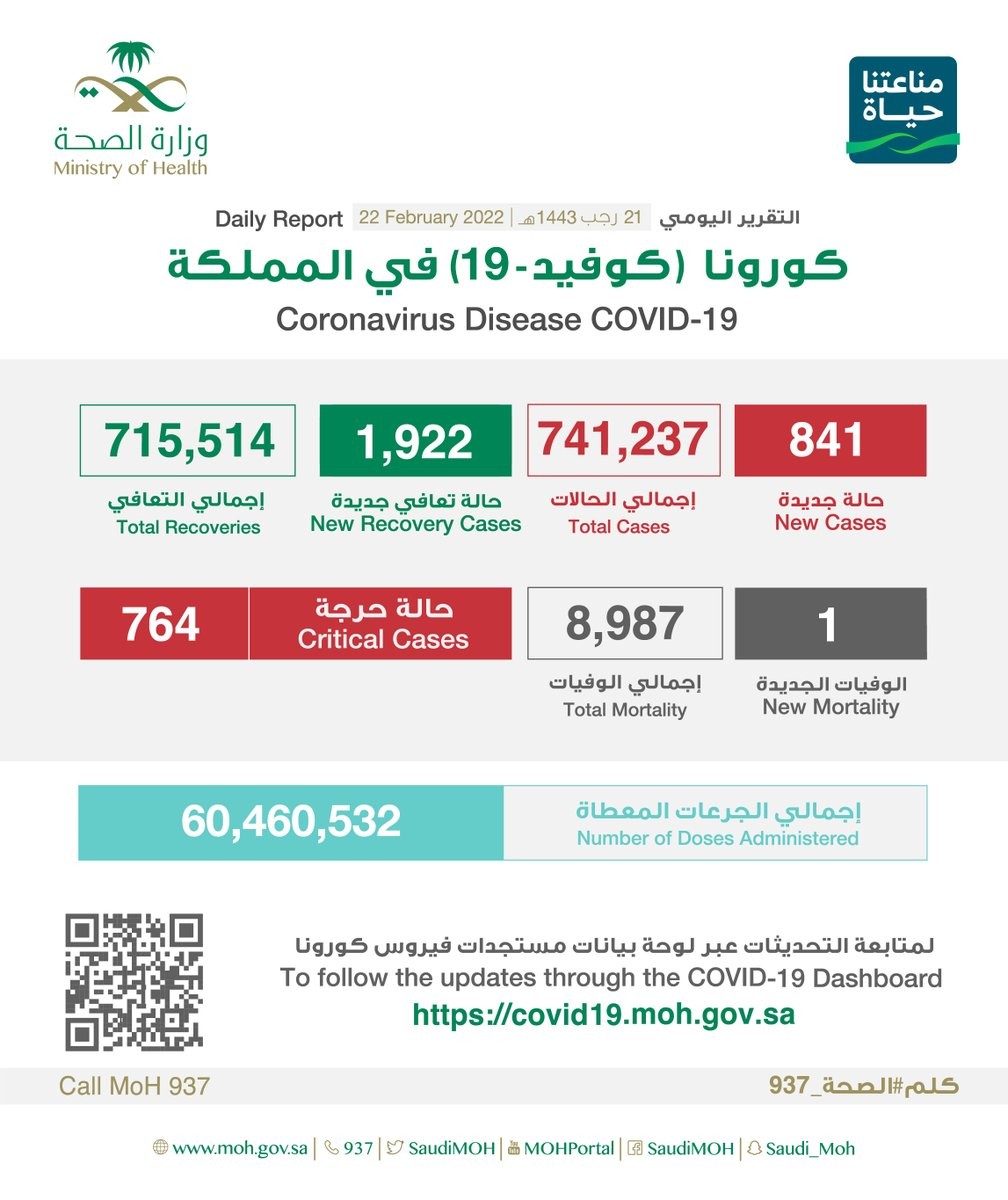 سجلت الإصابات الجديدة بفيروس كورونا (كوفيد 19) في المملكة، انخفاضاً كبيرًا خلال الـ24 ساعة الماضية، حيث بلغت 841 حالة في أدنى رقم يُسجل بالمملكة منذ شهور، ليرتفع إجمالي الإصابات إلى 741237 حالة.