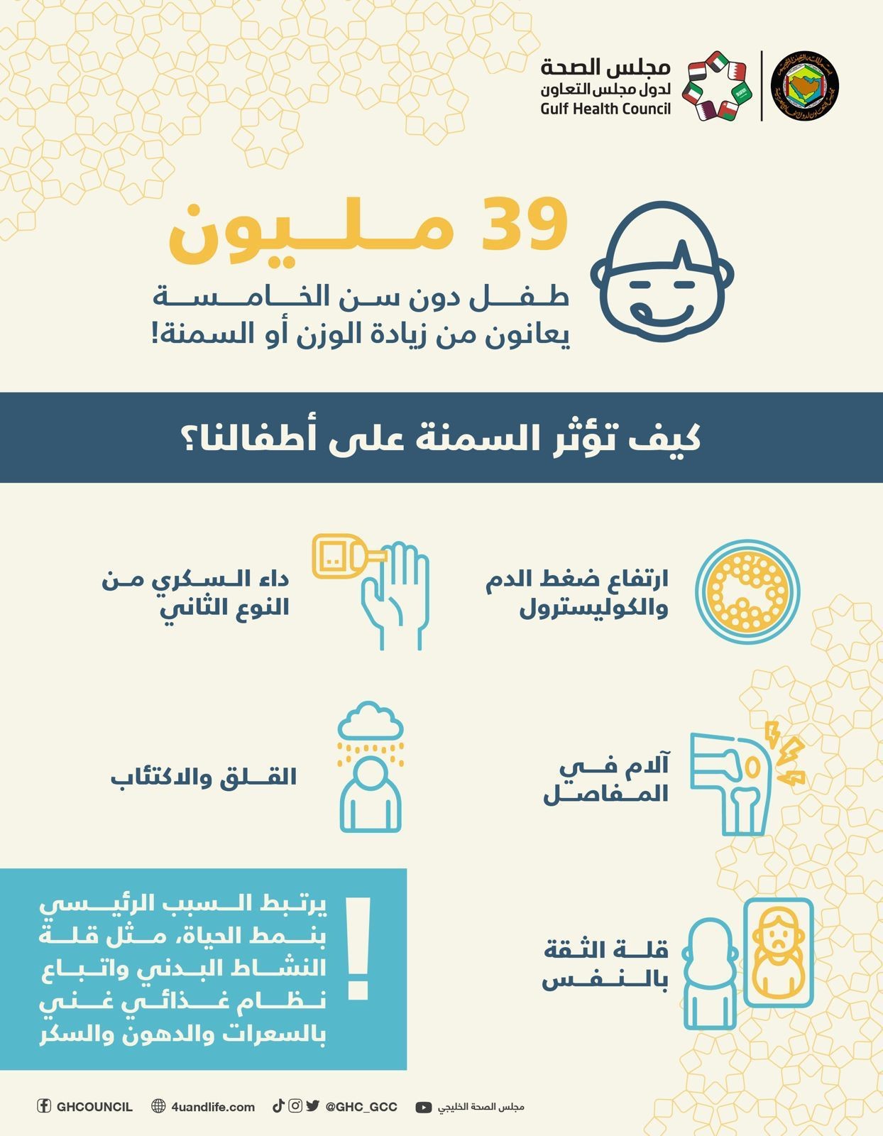 قال مجلس الصحة الخليجي عبر تغريدة له في حسابه الرسمي في تويتر أن 39 مليون طفل دون سن الخامسة حول العالم يعانون من زيادة الوزن أو السمنة.