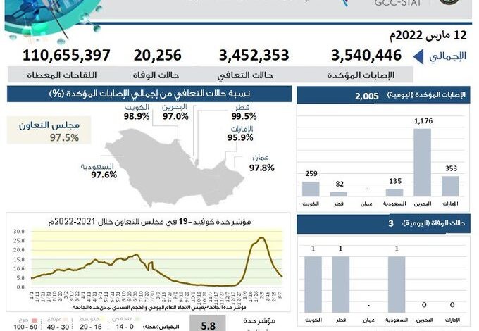 وقال مركز الإحصاء الخليجي عبر حسابه في تويتر: إن إجمالي اللقاحات المعطاة بدول التعاون بلغ 110,655,397 جرعة، وبلغت الإصابات المؤكّدة 3,540,446 حالة، وإجمالي حالات التعافي 3,452,353 حالة، وإجمالي حالات الوفاة بلغ 20256 حالة حتى يوم أمس.