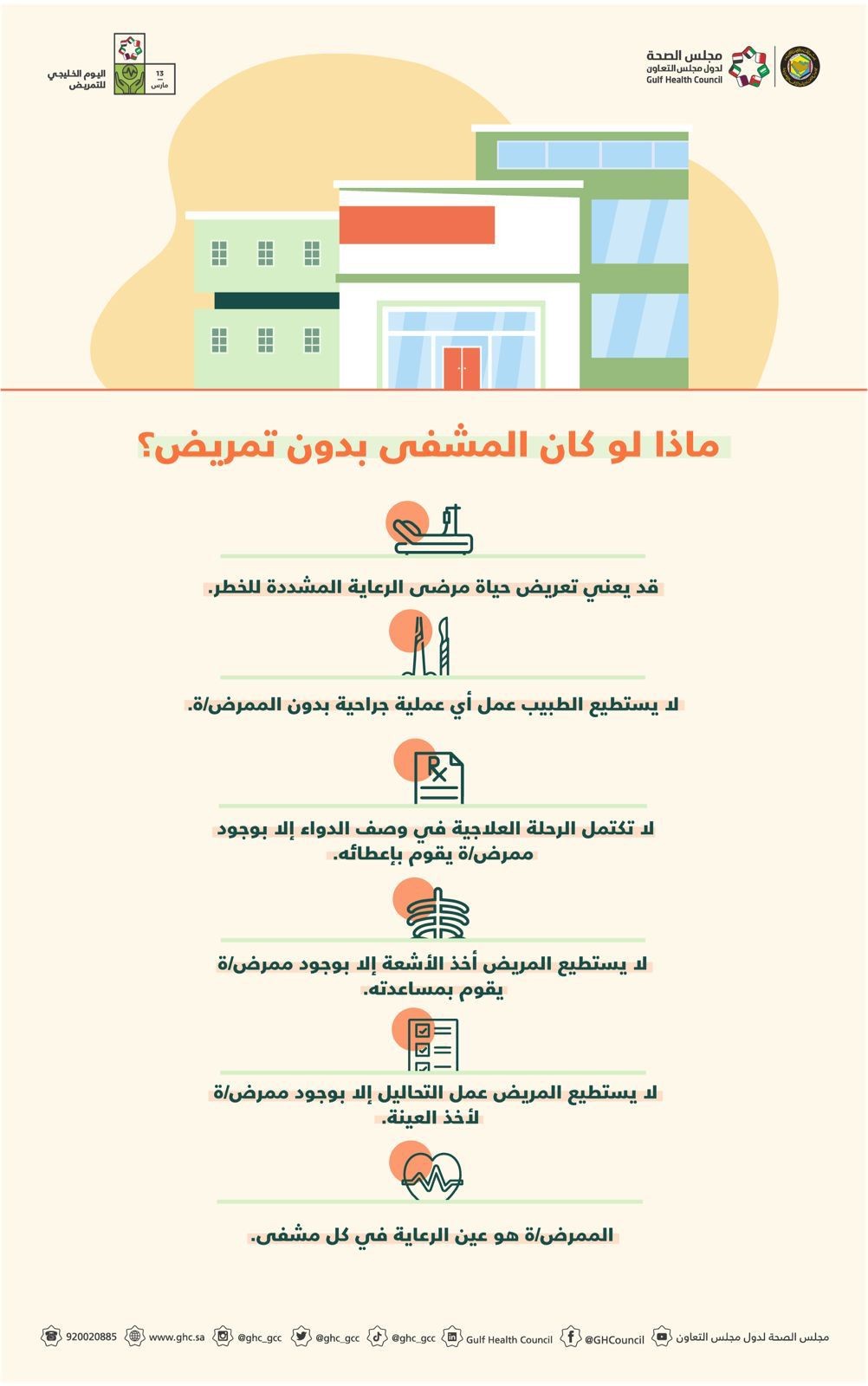 هذا وسلط مجلس الصحة الخليجي الضوء على أهمية مهنة التمريض مقارنه بالمهن الصحية الأخرى حيث طرح تساؤلاً حول ماذا لو خلت المشافي من التمريض ؟ ماذا سيحل بها؟، وقال: أنه قد يتعرض حياة مرضى الرعاية المشددة للخطر، وأيضاً قد لايستطيع الطبيب عمل أي عملية جراحية دون التمريض، وأن الرحلة العلاجية لاتكتمل في وصف الدواء الا بوجود ممرض يقوم بالمساعدة، وأن المريض لايستطيع عمل التحاليل الا بوجود ممرض يقوم بأخذ العينة اللازمة منه، وأختتم المجلس حديثه حول أهمية مهنة التمريض في سير عجلة المنضومة الصحية بأن الممرض هو عين الرعاية في كل مشفى.