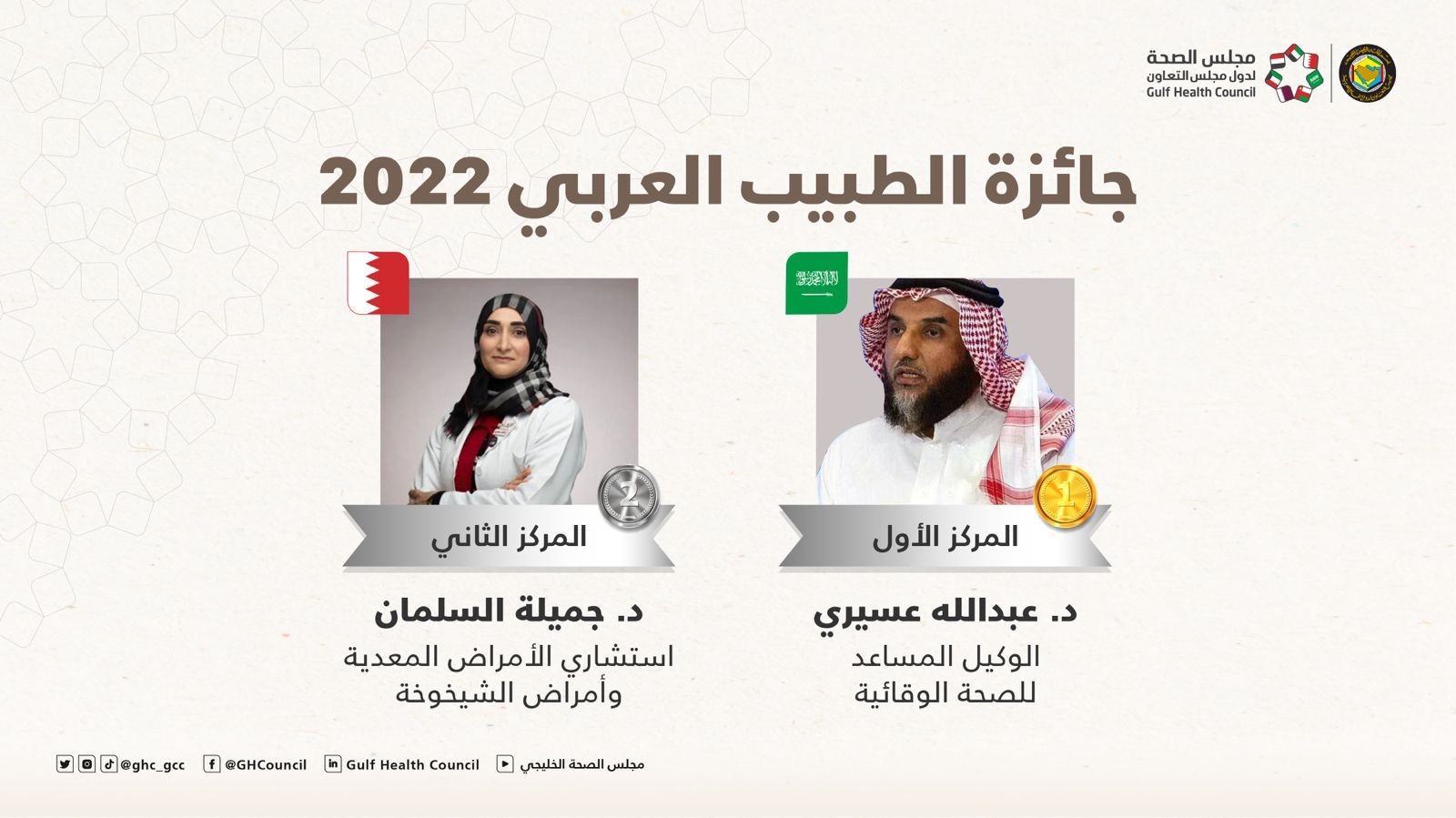 حيث حصل مرشح المملكة العربية السعودية الدكتور عبدالله بن مفرح عسيري وكيل وزار ة الصحة المساعد للصحة الوقائية، على جائزة المركز الأول، فيما حصلت مرشحة مملكة البحرين، الدكتورة جميلة السلمان استشارية الأمراض المعدية وأمراض الشيخوخة في مجمع السلمانية الطبي على جائزة المركز الثاني.