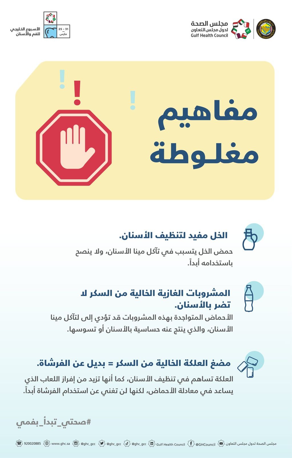 وعرج مجلس الصحة الخليجي خلال حملته للعديد من المفاهيم المغلوطة بين الناس حول العناية بالأسنان وذكر منها : ما يشاع بأن الخل مفيد لتنظيف الأسنان ، والحقيقة بأن حمض الخل يتسبب في تآكل مينا الأسنان ولا ينصح بأستخدامه أبداً، وايضاً من المفاهيم المغلوطة أن المشروبات الغازية الخالية من السكر لا تضر بالأسنان، والحقيقة أن الأحماض المتواجده في هذه المشروبات قد تؤدي إلى تآكل مينا الأسنان، والذي ينتج عنه حساسية بالأسنان أو تسويها، وأختتم المفاهيم المغلوطة بأن مضغ العلكة الخالية من السكر هي بديل عن فرشاة الاسنان، ولكن الحقيقة هي أن العلكة تساهم في تنظيف الاسنان وايضاً تقوم بزيادة إفراز اللعاب الذي يساعد في معادلة الأحماض، لكنها لا تغني عن استخدام فرشاة الاسنان أبداً.