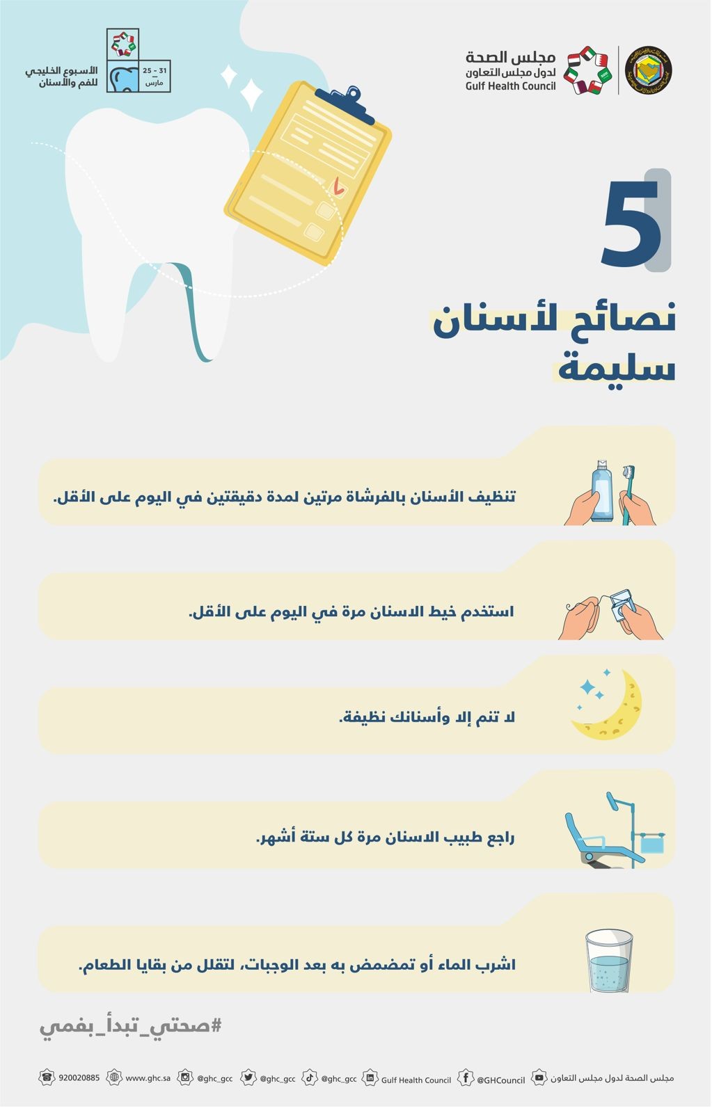 شارك مجلس الصحة لدول مجلس التعاون في الأسبوع الخليجي للفم والأسنان والذي انطلق اليوم الجمعة ٢٥ مارس ويستمر حتى ٣١ من الشهر نفسه، وذلك بالعديد من الرسائل التوعوية التي نشرها عبر حساباته الرسميه في وسائل التواصل الاجتماعي.