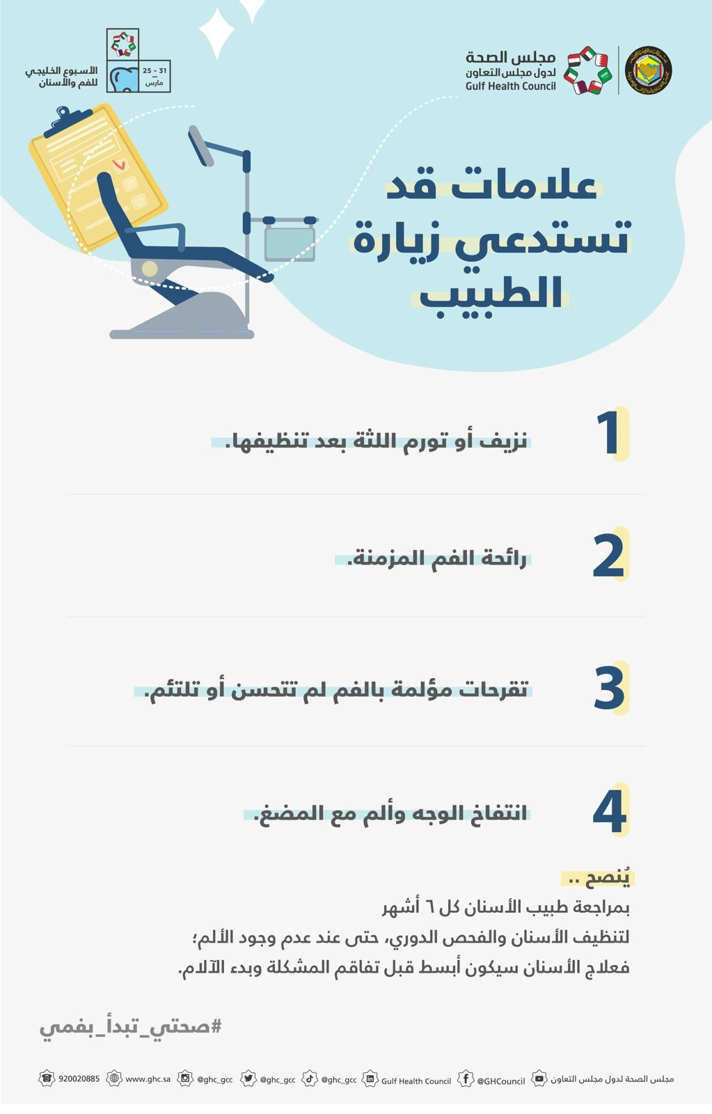 وتطرق المجلس لعلامات قد تستدعي زيارة طبيب الأسنان في حال حدوثها وهي : حصول نزيف أو تورم اللثة بعد تنظيفها، وحصول رائحة مزمنه للفم، وتقرحات مؤلمة بالفم لم تتحسن أو تلتئم، وحدوث انتفاخات بالوجه وألم عند المضغ، ونصح المجلس بمراجعة طبيب الأسنان كل ٦ أشهر وتنظيف الاسنان والفحص الدوري لها حتى عند عدم وجود الألم لأن مع هذه الخطوات يكون علاج الأسنان أبسط قبل تفاقم المشكلة وبدء الآلام.
