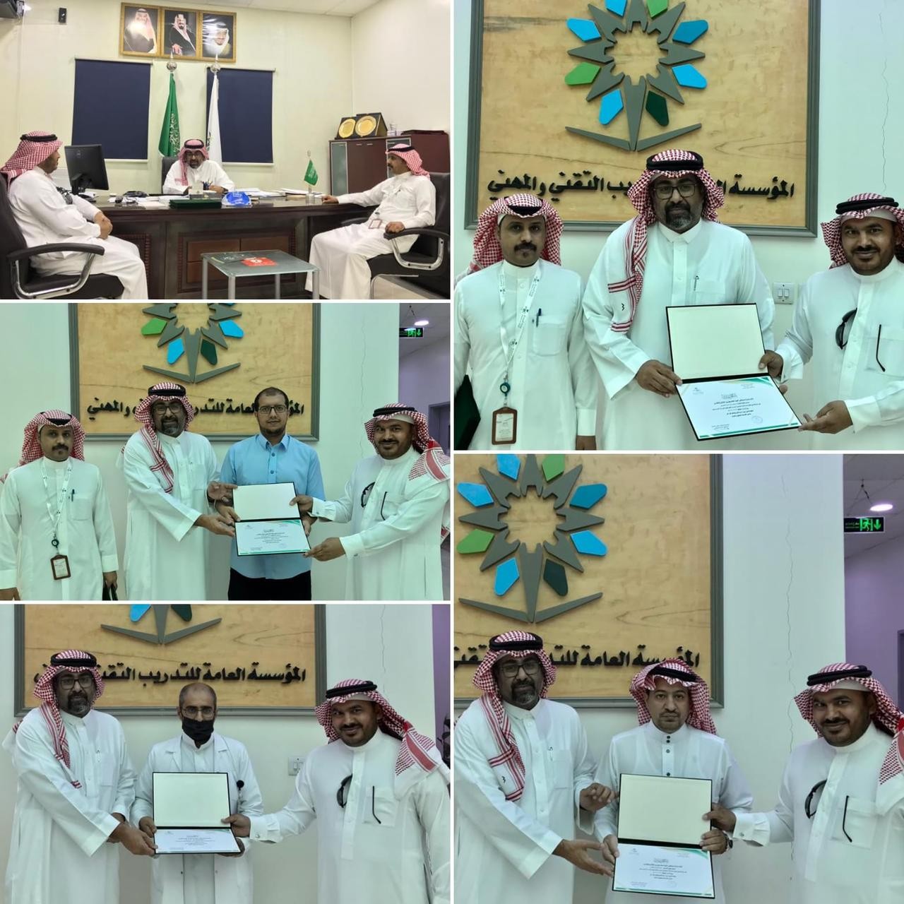 ممثلاً بمساعد مدير الشؤون المالية والإدارية الأستاذ أحمد عطية الحرتومي ومدير التوعية الصحية الأستاذ عبدالمجيد الزهراني شهادات الشكر والتقدير للكلية التقنية بالليث نظير مشاركتهم الفاعلة وجهودهم