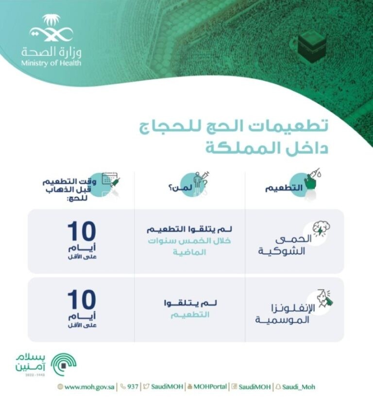 كما أشارت الصحة إلى أن من التطعيمات اللازم تلقيها لحجاج الداخل هو تطعيم الإنفلونزا الموسمية، وذلك لمن لم يتلقوا التطعيم على أن يكون ذلك قبل 10 أيام من ذهاب الحاج إلى الحج.