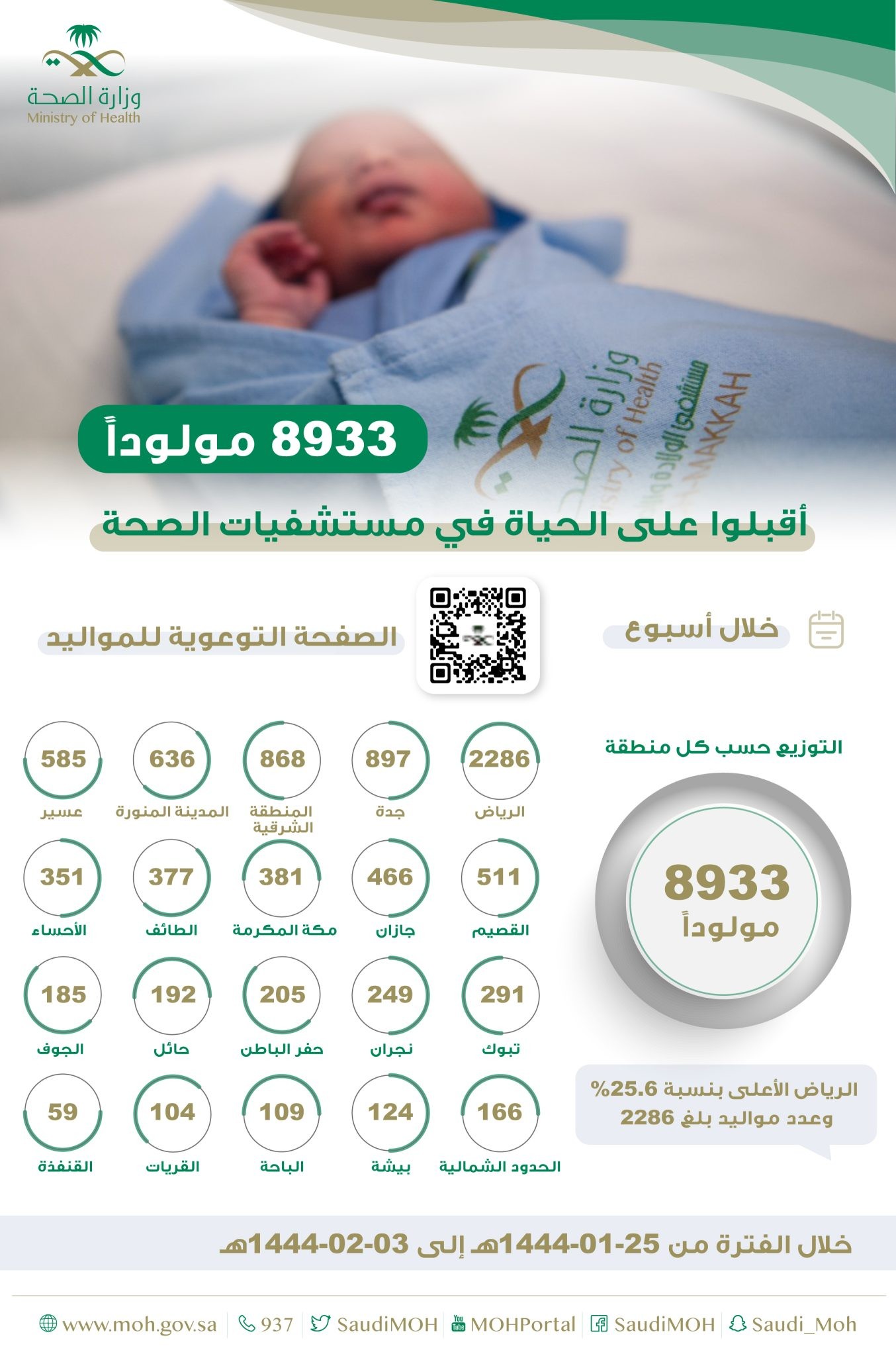 وفي منطقة المدينة المنورة بلغ عدد المواليد 636 مولوداً، والقصيم 511 مولوداً، والقريات 104 مواليد.