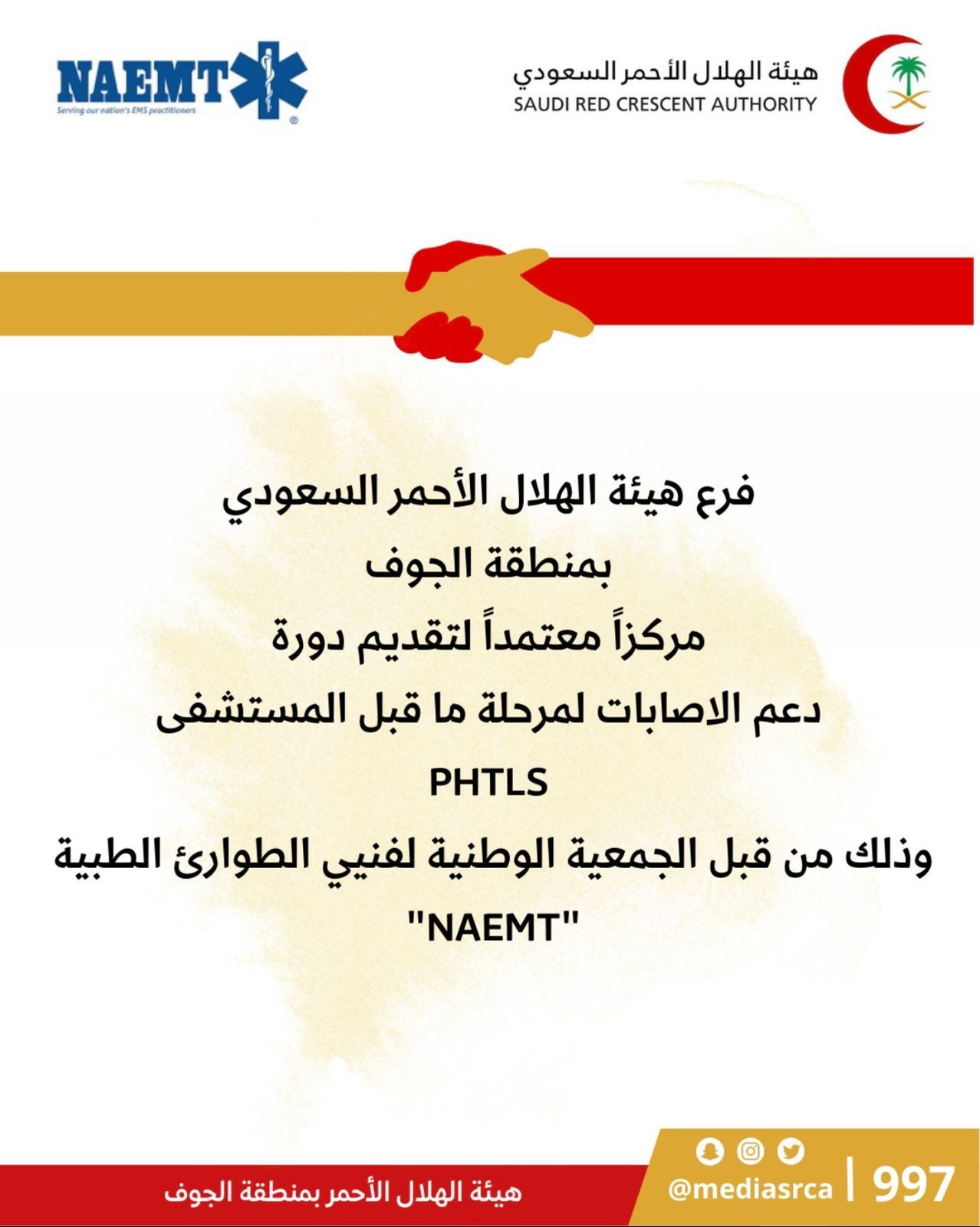 اُعتمد مركز التدريب التابع لفرع هيئة الهلال الأحمر السعودي بمنطقة الجوف مركزاً معتمداً لتقديم دورة دعم الاصابات لمرحلة ما قبل المستشفى PHTLS وذلك من قبل الجمعية الوطنية لفنيي الطوارئ الطبية NAEMT .