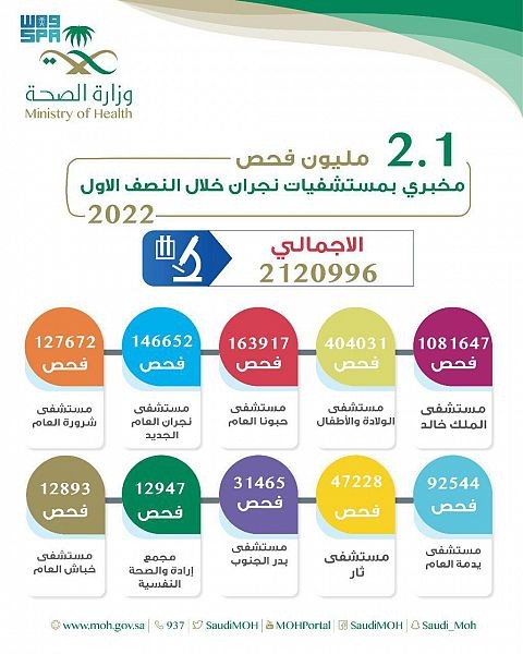 أجرت أقسام المختبرات وبنوك الدم بمستشفيات صحة نجران 2120996 فحصاً مخبرياً خلال النصف الأول من العام الجاري 2022. .